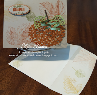 I cut it out using our Pumpkin Pie Glimmer Paper. Isn't it cute?! I used the Vintage leaves stamp set to create the background and the Layering Oval Framelits for my sentiment. The sentiment was put together with the Labeler Alphabet stamps